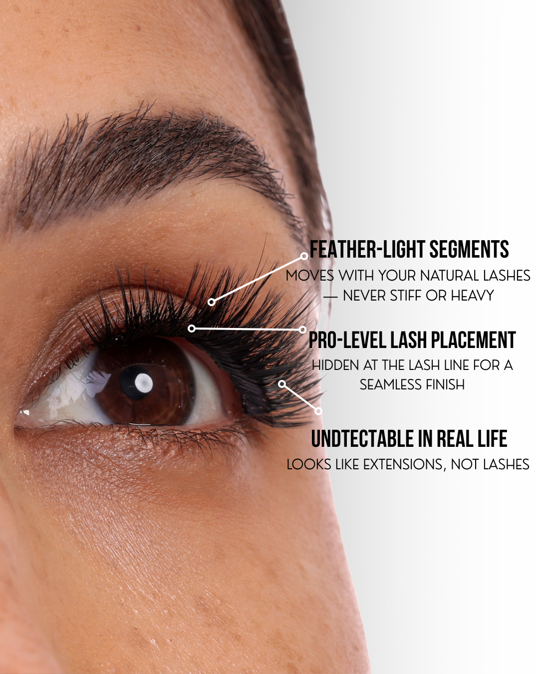They’re designed to look like professional lash extensions, not like obvious strip lashes. The segment placement + under-lash design creates a blended, undetectable finish.