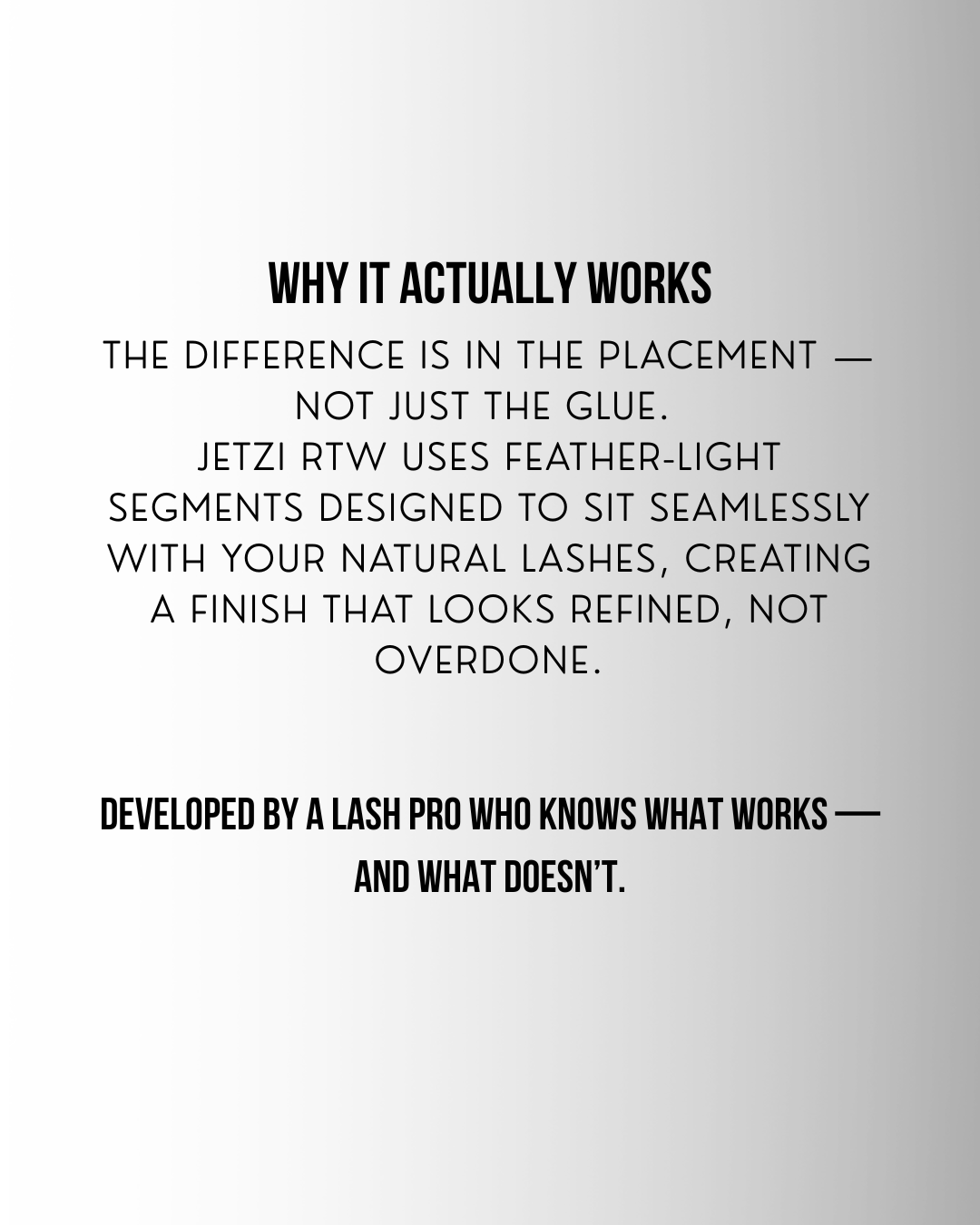 RTW combines professional artistry with effortless wear. Instead of thick, heavy, obvious strips, Jetzi RTW uses feather-light segments and under-lash placement to create a polished, extension-like finish — without glue, appointments, or damage.